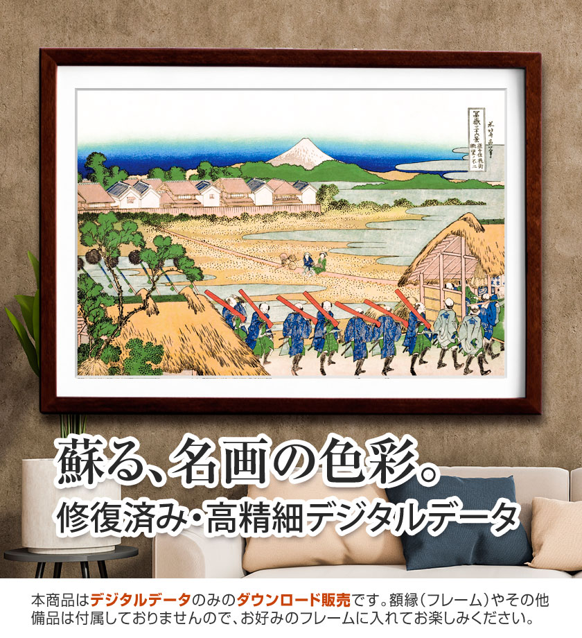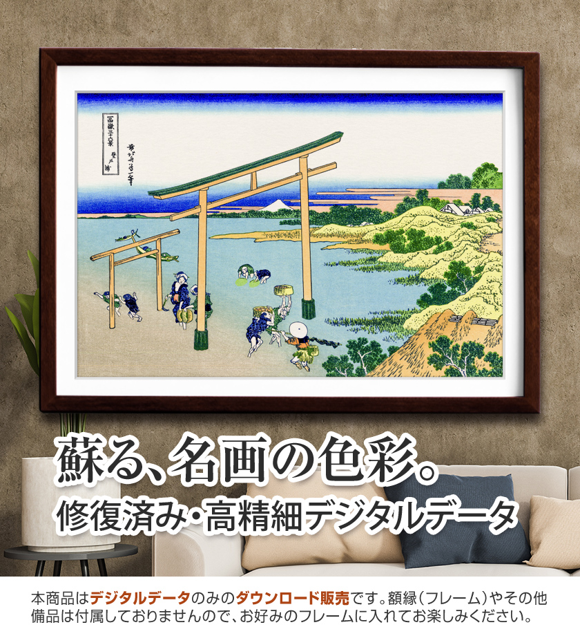 《登戸浦》は、海辺の広がりと静かな遠景が印象的な作品です。手前には海岸で働く人々の姿が描かれ、その向こうに穏やかな海と富士山が広がります。波は比較的静かで、《神奈川沖浪裏》のような劇的な迫力とは異なり、落ち着いた海辺の日常が表現されています。富士山は空と海の間に穏やかに現れ、風景全体に安定感を与えています。エピソードとして、北斎は同じ海でも場所によって異なる表情を描き分けており、この作品では海辺の生活と自然の調和が主題になっています。静けさの中に広がる余白が心地よい一枚です。