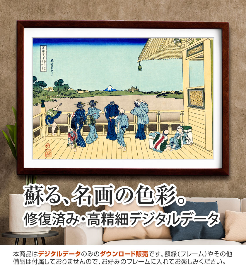 《従千住花街眺望ノ不二》は、千住のにぎわいの中から富士山を望む作品です。画面には町の活気や人の動きが感じられ、その奥に富士山が静かに現れます。都市のにぎやかさと遠くの富士という対比が、江戸らしい風景の魅力を生み出しています。エピソードとして、千住は宿場町として人の往来が多く、江戸の入口として栄えた場所でした。北斎はこうした都市のエネルギーの中にも、変わらぬ富士の姿を描き込み、日常と象徴を結びつけています。