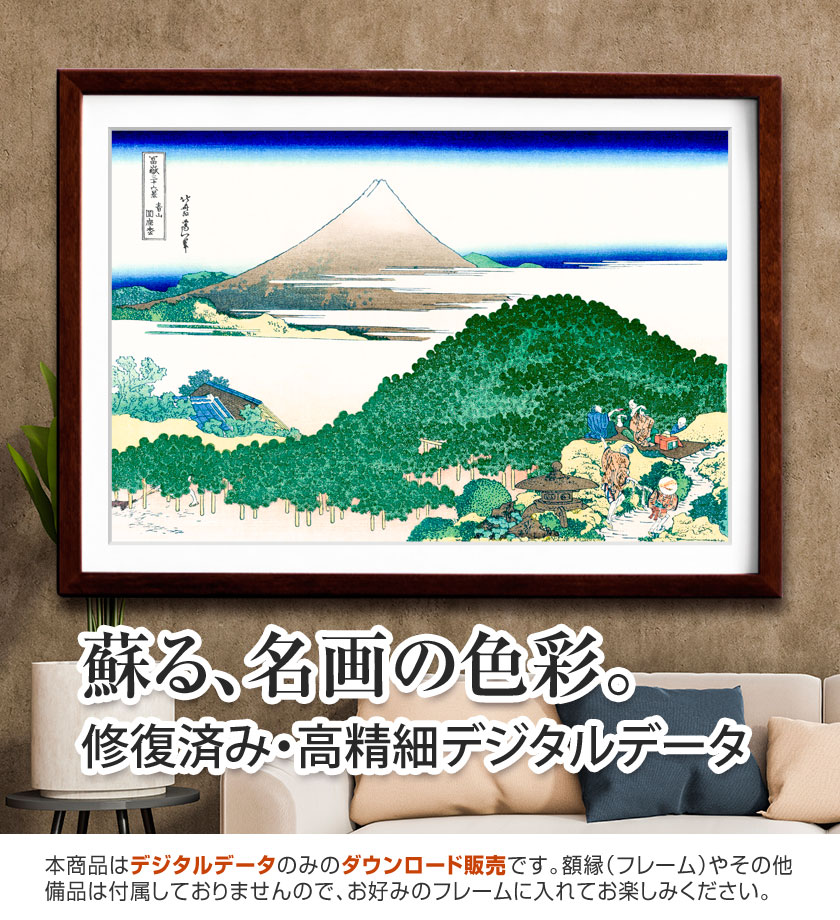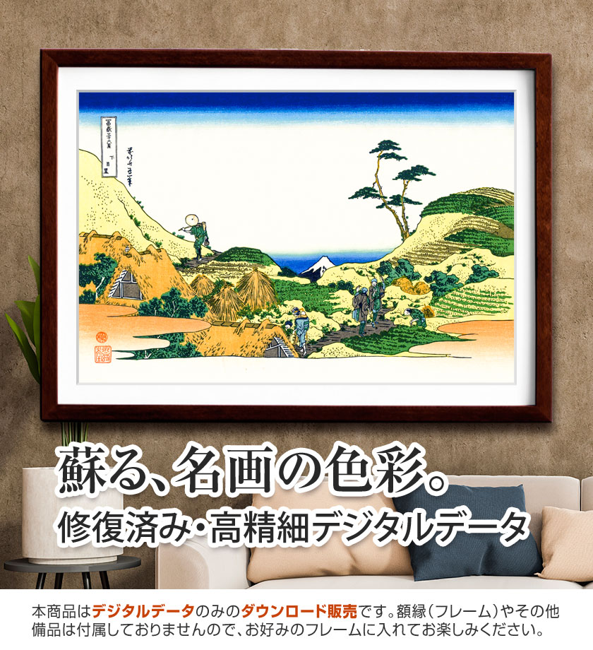 《下目黒》は、江戸郊外ののどかな景色の中に富士山を望む作品です。手前には農地や家並みが広がり、都市の中心から少し離れた穏やかな暮らしの様子が感じられます。富士山は遠景にありながらも明確な存在感を持ち、日々の生活の中に自然の象徴が静かに溶け込んでいます。北斎はこの作品で、名所としての派手さよりも、江戸周辺のありふれた風景の中にある美しさを丁寧に描いています。エピソードとして、目黒一帯は当時から富士見の名所として親しまれ、季節ごとの散策地としても人気がありました。身近な風景の中に富士を見出す北斎らしい視点がよく表れています。