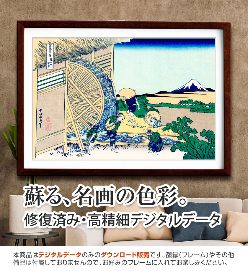 《隠田水車》は、水車のある農村風景を描いた作品で、江戸の近郊に残る自然の豊かさが感じられます。画面中央には大きな水車が置かれ、その周囲で人々が日常の仕事を続けています。奥には富士山が穏やかに姿を見せ、生活の営みを見守るような存在となっています。水車の円形と富士山の三角形が画面の中で対照的に配置され、北斎らしい構図の面白さも感じられます。エピソードとして、隠田は現在の東京・原宿周辺にあたり、当時はまだ田畑や水路が広がる地域でした。現代の都市風景からは想像しにくい昔の姿を伝える一枚でもあります。