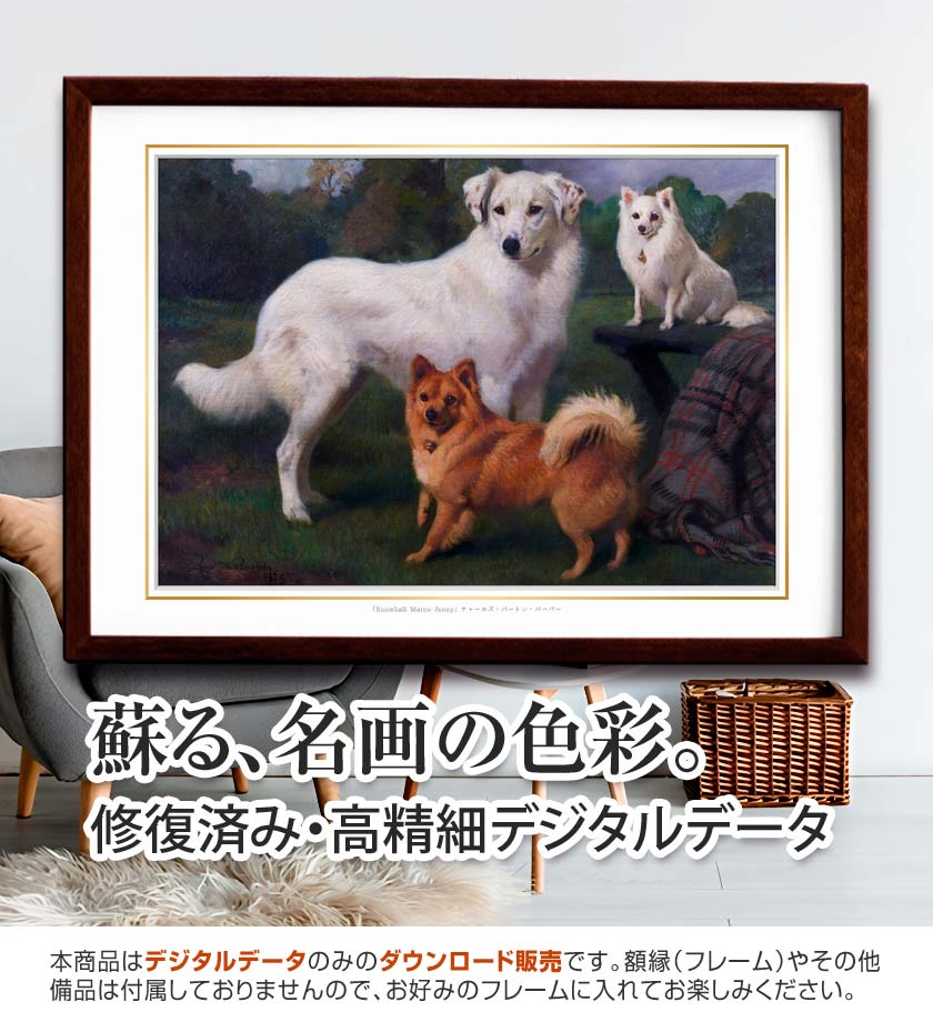 本作『Snowball, Marco, Janey』の最大の特徴は、3匹の犬それぞれの固有の名前がそのまま作品タイトルになっている点にあります。チャールズ・バートン・バーバーの作品群において、固有名詞が冠された作品は、それが特定の飼い主のために描かれた「実在する犬たちの肖像画」であることを意味します。