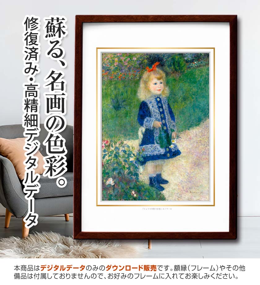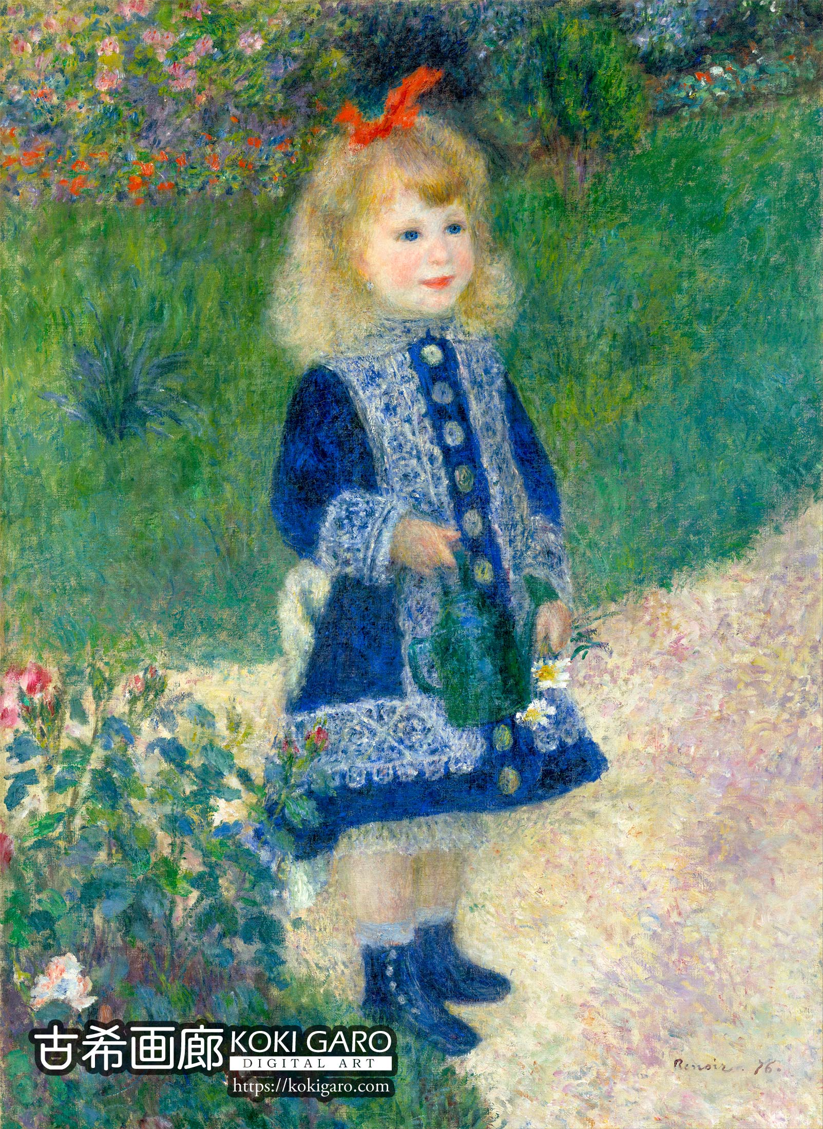青いドレスに赤いリボン、そして手には小さなじょうろ。お花に囲まれてちょこんと立つ女の子の姿は、まるで絵本の一場面のようです。ルノワール特有の柔らかい筆使いで描かれた彼女の表情からは、子供らしい無垢な可愛らしさと、穏やかな時間が伝わってきます。