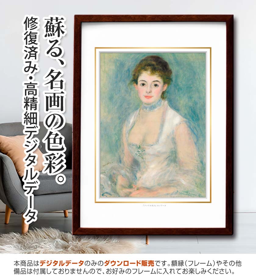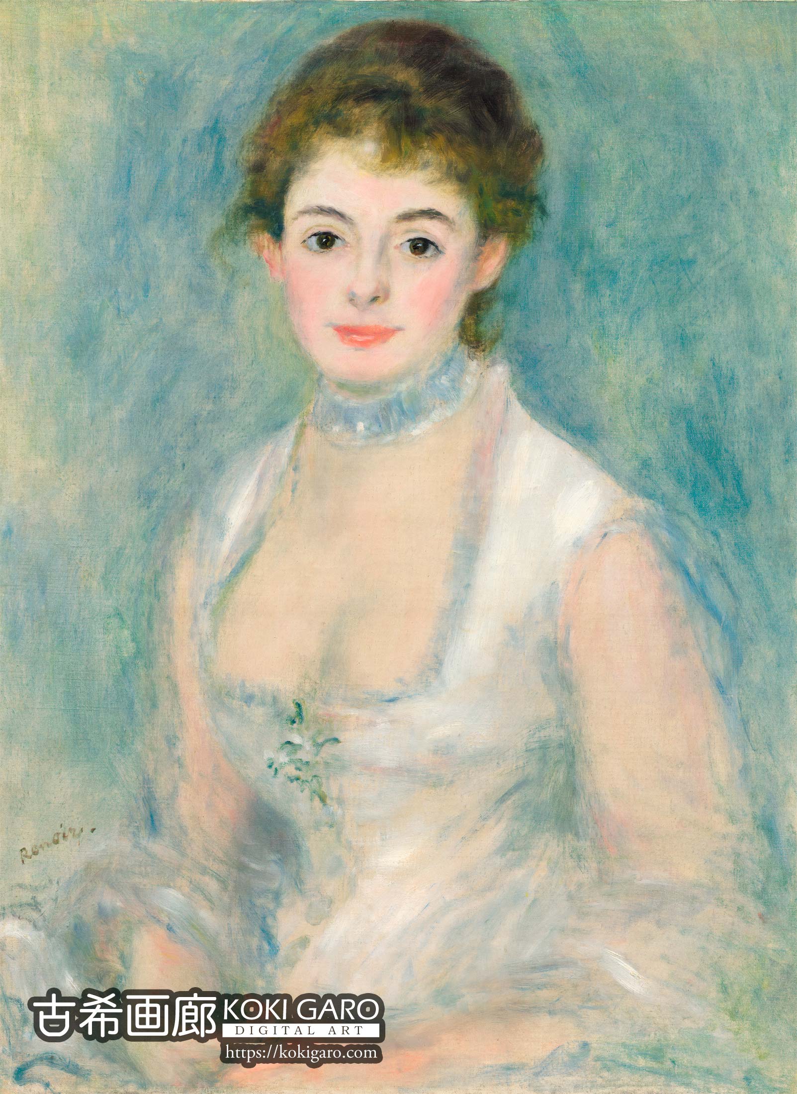 ルノワールが描いた女性像の中でも、特に「気品」と「柔らかさ」が際立つ傑作です。モデルとなったのは、当時ルノワールが好んで描いた女優のアンリオ夫人。彼女の持つ穏やかな魅力が、キャンバスいっぱいに広がっています。