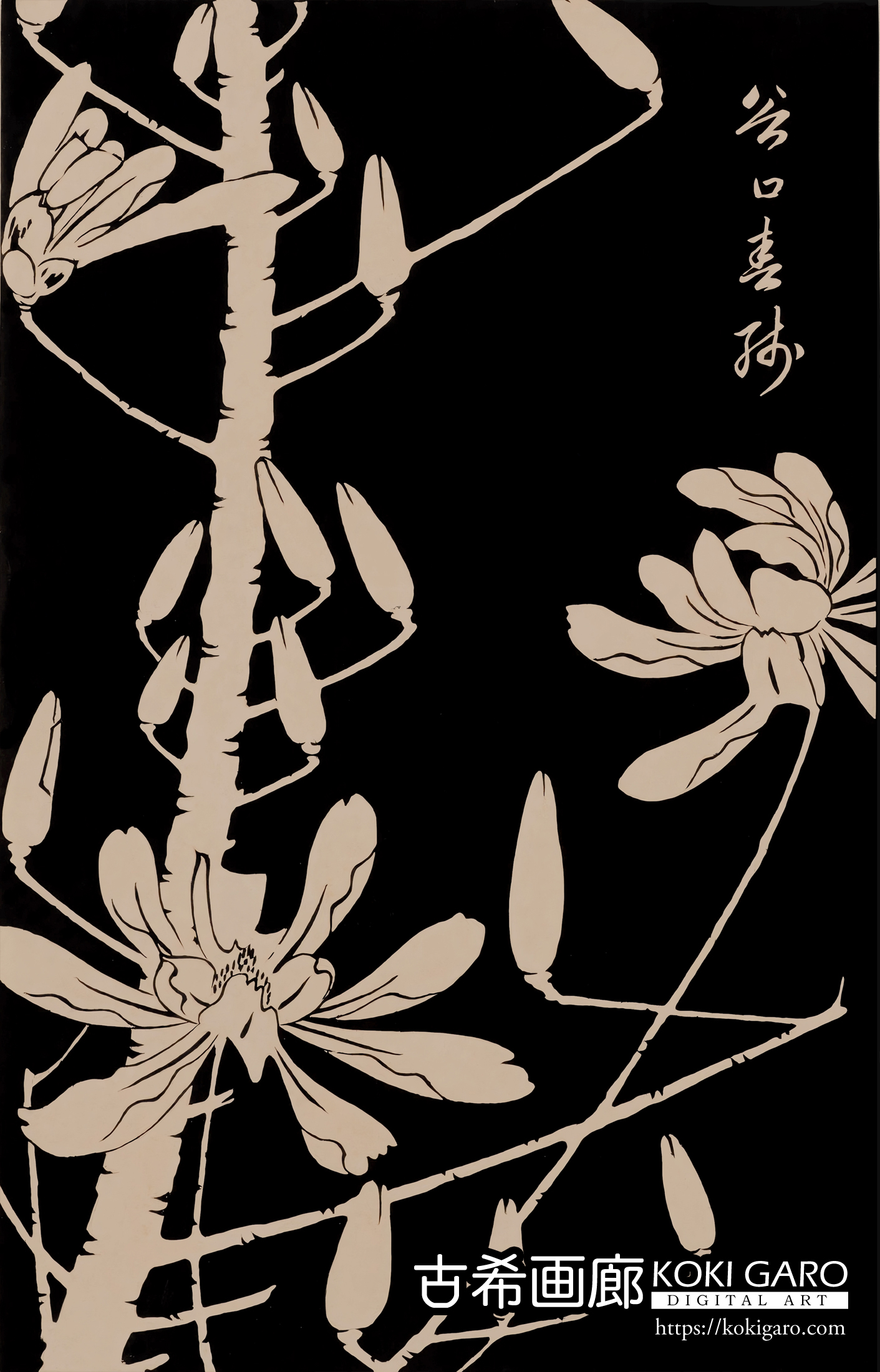この圧倒的な黒は、ただの背景ではありません。 それは、夜の闇であり、あるいは命が生まれる前の、静かな静かな宇宙のような場所です。 タイトルの「玄圃(げんぽ)」は仙人が住む不思議な庭を、「瑤華(ようか)」は宝石のように美しい花を意味しています。