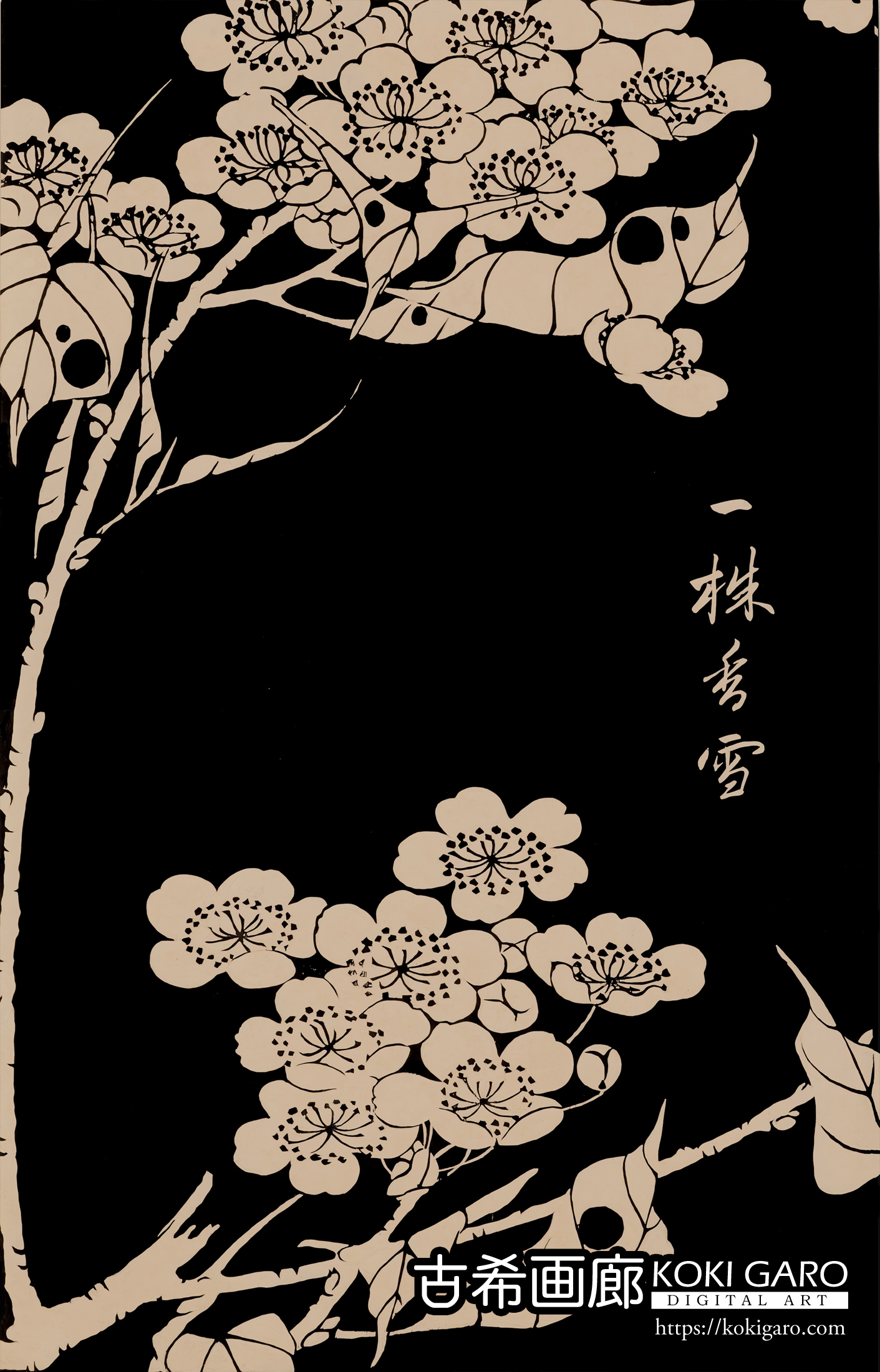 この圧倒的な黒は、ただの背景ではありません。 それは、夜の闇であり、あるいは命が生まれる前の、静かな静かな宇宙のような場所です。 タイトルの「玄圃(げんぽ)」は仙人が住む不思議な庭を、「瑤華(ようか)」は宝石のように美しい花を意味しています。