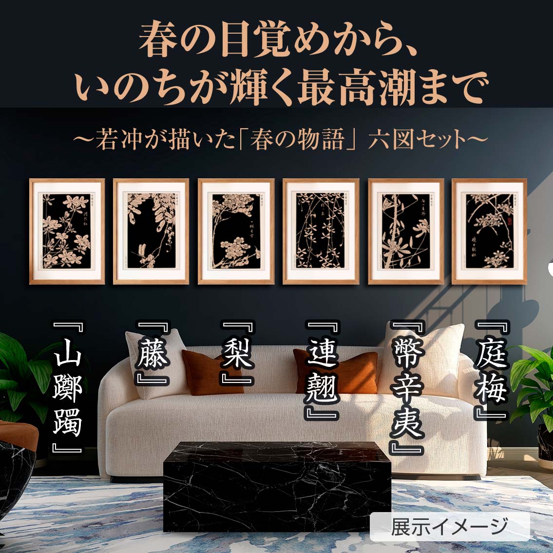 このセットは、伊藤若冲の傑作『玄圃瑤華(げんぽようか)』の中から、春の移ろいを美しく彩る六つの図を厳選し、一つの物語としてまとめたものです。