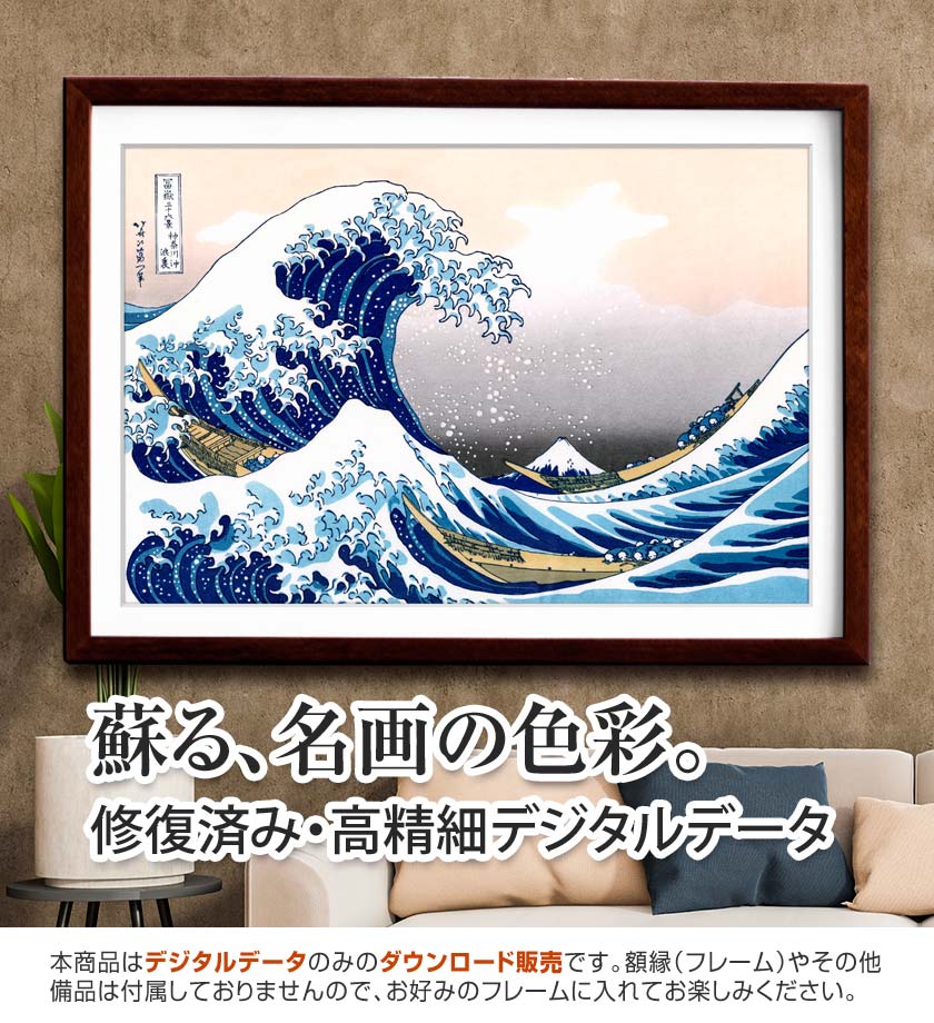• 計算された幾何学的構図 画面全体が円弧を描くような構図になっており、観る者の視線は自然と波の渦の中心、そしてその奥に小さく見える富士山へと導かれます。この「黄金比」にも通じる完璧なレイアウトが、時代を超えて人々を惹きつける理由です。