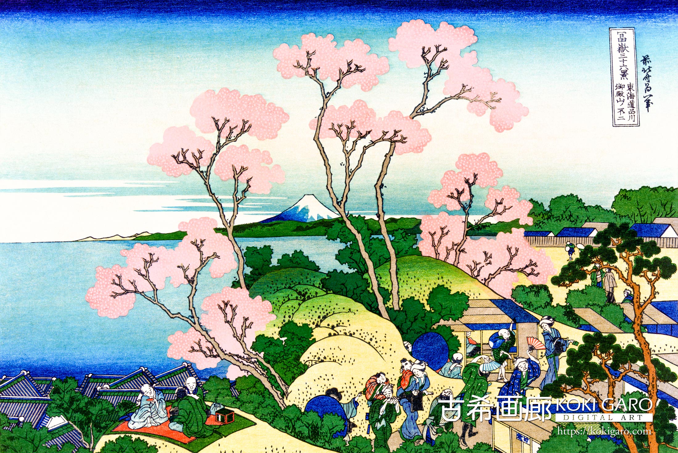 高台からの開放感:御殿山(現在の品川区)から海を見下ろすような、春らしい広がりを感じる視点が見事です。