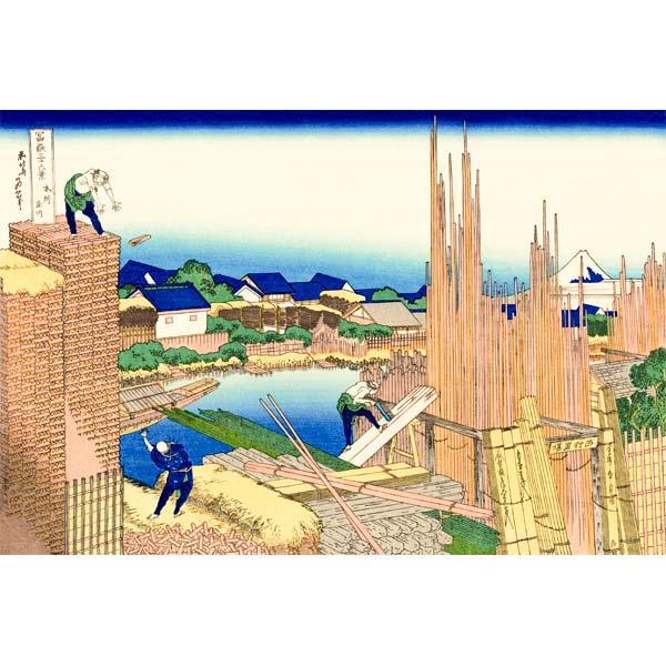 【始動】本所立川(ほんじょたてかわ) 高く積み上げられた材木と、活気あふれる職人たち。新たな事業や生活を組み上げる「始まり」のエネルギーに満ちた、力強い一枚です。