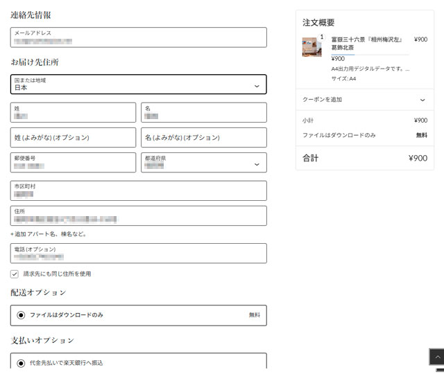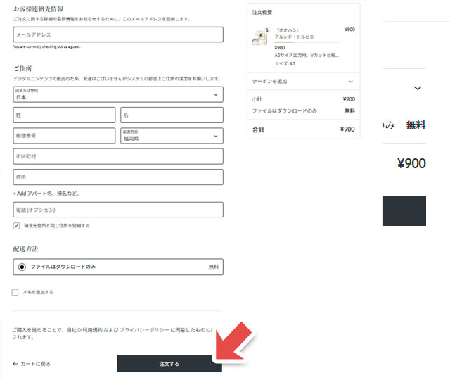 ご注文内容をご確認の上、お名前・住所・メールアドレスなど、必要事項をご記入ください。